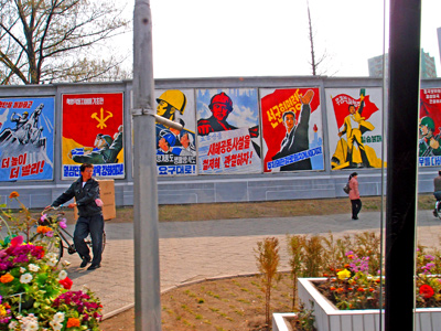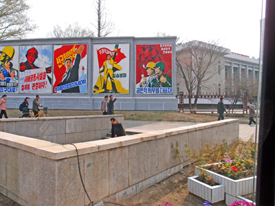 Bellicose North Korean statements looking down from billboards.