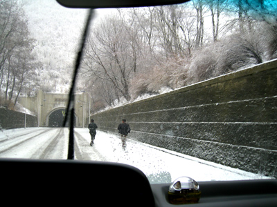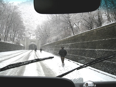Only a broken down truck was blocking the opposite lane in the tunnel. No emergency road box, no road service either. If we would get stuck we would be stuck till the weather would change. After we had put on our coats, the car heating was barely sufficient. I figured out that 5 more minutes of heavy snowfall and we would be mired in layers of sludge and ice.