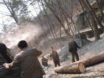 north of Pyongyang, I was taking photos of “deja vu“, six forest workers, uploading stems when back in 1950, there were two men who did the job and an infant watching… .