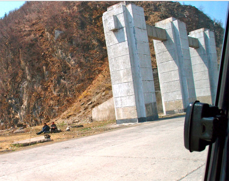 Ever so often we pass concrete structures on the left and right side of the highway from Panmunjon to Pyongyang . Ursula’s questions about the purpose of it, Tung Hui answers with “highway decorations“.
